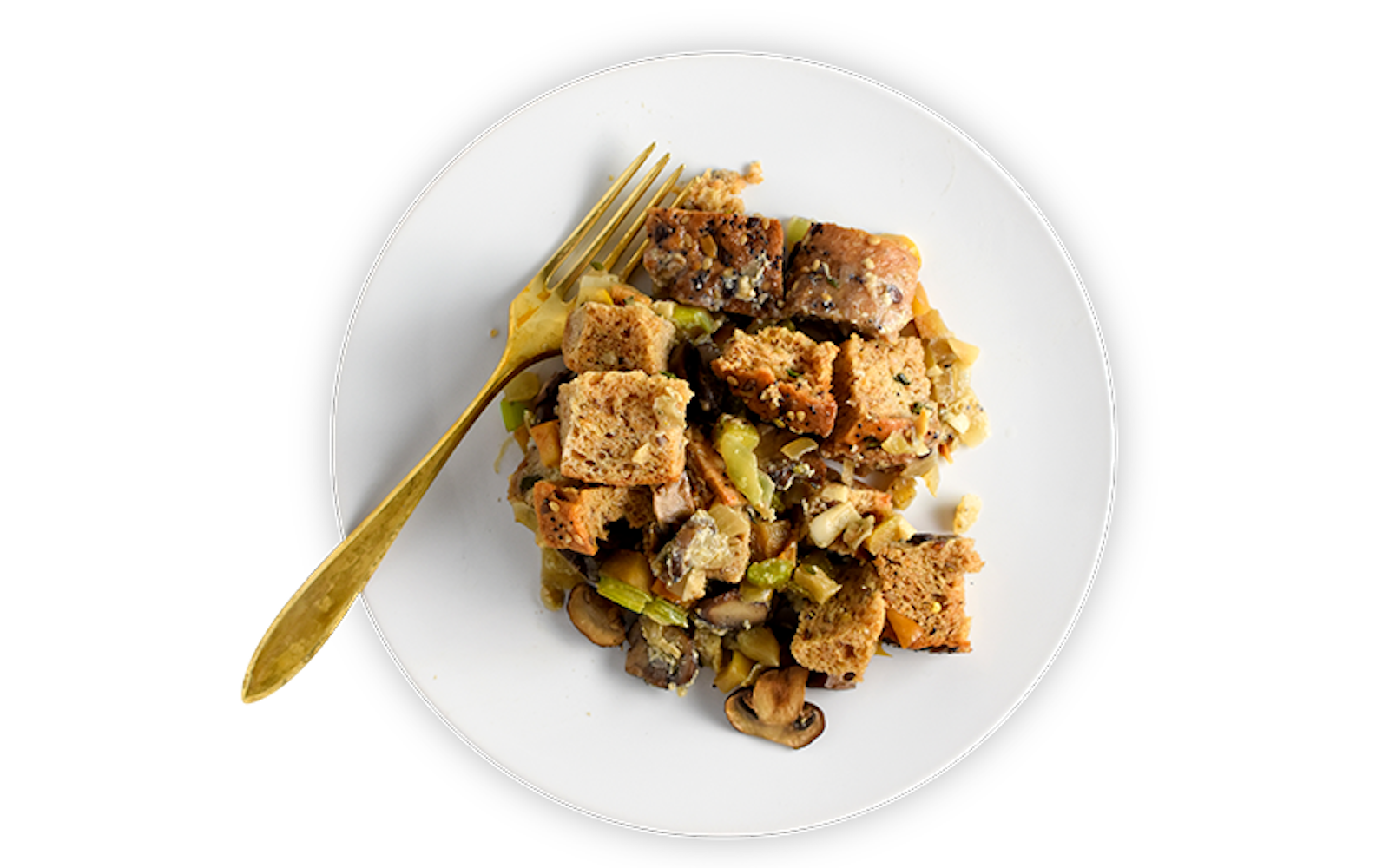 Fresh herbs add a punch of flavor to this lightened-up stuffing, while sautéed vegetables and apple add moisture, boost fiber, and minimize the carbohydrates. Of course, great stuffing starts with good bread, so be sure to choose a rustic, wholegrain or multigrain loaf from a local bakery or your grocery’s bakery section. If your loaf is larger than what the recipe needs, freeze the extra in an airtight container for up to two months. Then, defrost at room temperature before heating to eat. Get a head start by toasting the bread cubes one day in advance. Cool completely before storing in an airtight container.